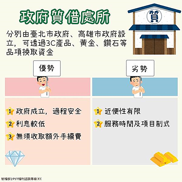 分別由臺北市政府、高雄市政府設立,可透過3C產品、黃金、鑽石等品項換取資金。