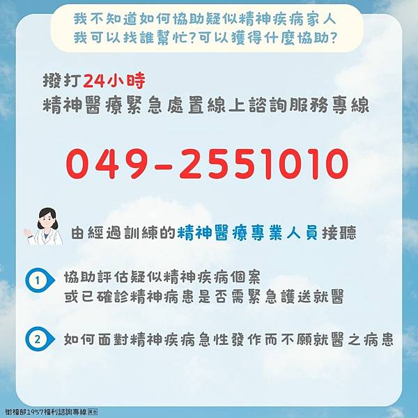 (一)24小時精神醫療緊急處置線上諮詢服務專線(049-2551010)